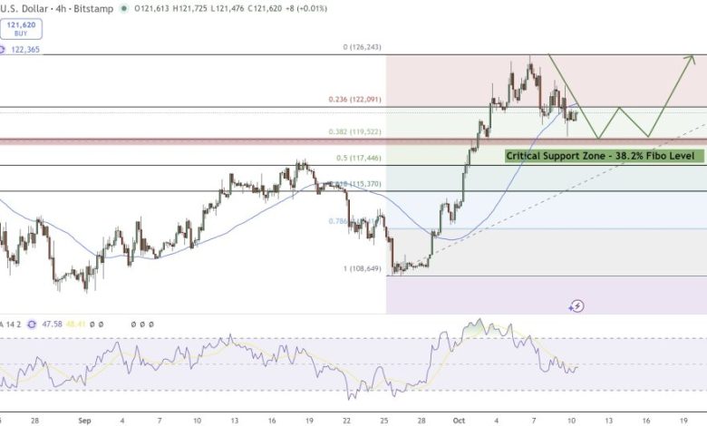 عملکرد قیمت بیت‌کوین در یک محدوده باریک بین ۱۱۹,۵۰۰ دلار و ۱۲۲,۵۰۰ دلار باقی مانده و یک مثلث متقارن کوتاه‌مدت را تشکیل داده است. نمودار ۴ ساعته، سطح فیبوناچی ۳۸.۲ درصدی نزدیک به ۱۱۹,۵۲۰ دلار را به عنوان یک منطقه حمایتی حیاتی برجسته می‌کند، در حالی که میانگین متحرک ۵۰ دوره‌ای (50-period SMA) در ۱۲۲,۳۶۵ دلار به عنوان مقاومت بالایی عمل می‌کند.
