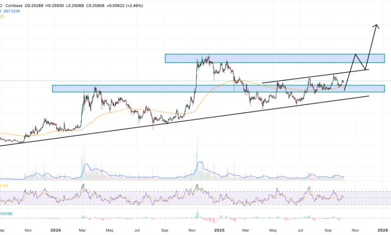 نمودار روزانه نشان میدهد که دوجکوین برای ماهها در روند صعودی بوده، از کف نوسانی ۰.۰۶ دلار تا حداقل ۰.۴۹ دلار در دسامبر ۲۰۲۴ حرکت کرده که به معنای سود ۷۲۰ درصدی در تنها ۲۴ ماه است.