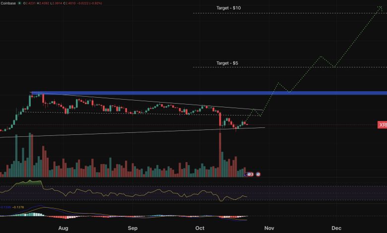 XRP با قیمت ۲.۴۰ دلار، در هفت روز گذشته ۴٪ و در یک ماه گذشته ۱۵٪ کاهش داشته، در حالی که افزایش بسیار چشمگیر ۳۴۰٪ را در یک سال گذشته حفظ کرده است.
