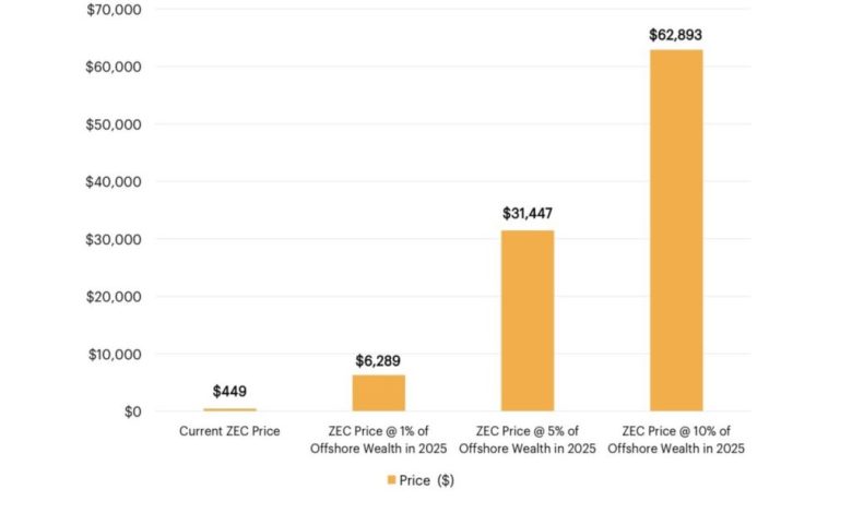 تور تورنس، مشاور زیکش، این پتانسیل را تشریح کرده و اشاره کرده که اگر تنها ۱٪ از ثروت فراساحلی (offshore wealth) به سمت زیکش جریان یابد، ارزش هر ZEC میتواند به ۶,۲۸۹ دلار برسد.