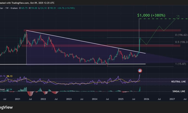در صورت بازگشت احتمالی روند، یک منطقه حمایت قوی در اطراف سطح ۰.۵ فیبوناچی (Fibonacci retracement) و یک منطقه تقاضای تاریخی (historic demand zone) نزدیک به ۱۰۵ دلار میتواند کف موقتی را مشخص کند. با یک دوره تثبیت، ادامه روند پایدارتر میتواند هدف ۱۰۰۰ دلاری الگوی مثلث را محقق کند که معادل ۳۸۰ درصد سود از قیمتهای فعلی است.