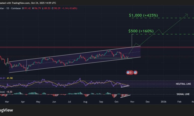 با این حال، با ورود سولانا به ترازنامه‌های شرکتی جریان اصلی و عمیق‌تر شدن مواجهه نهادی از طریق صندوق قابل معامله در بورس (ETF) نقدی (Spot ETF)، این رالی می‌تواند ۴۲۵ درصد دیگر نیز گسترش یابد و سول (SOL) را به سمت ۱۰۰۰ دلار پیش ببرد.