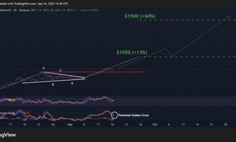 بایننس کوین ممکن است برای ادامه رالی صعودی آماده شود و یک کف احتمالی در سطح ۹۰۵ دلار تشکیل دهد که یک مقاومت تاریخی را به یک حمایت تبدیل کرده است. این سطح، سقف یک الگوی پرچم صعودی (Bullish Pennant) را نشان می‌داد که شکست پایدار از تثبیت قیمت و ادامه روند صعودی ماه آگوست را تأیید می‌کند.