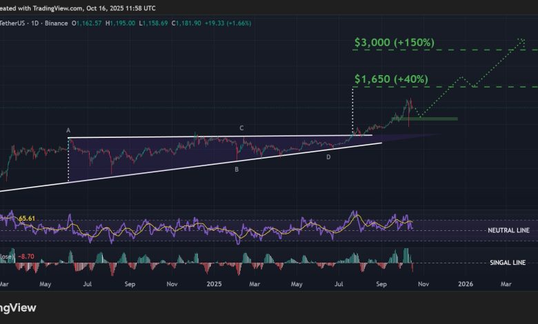 در صورت تداوم این قدرت، یک تغییر روند قاطع میتواند هدف شکست ۱۶۵۰ دلاری الگو را دوباره در کانون توجه قرار دهد و با حرکت ۴۰ درصدی به کاوش قیمتی جدید ادامه دهد.