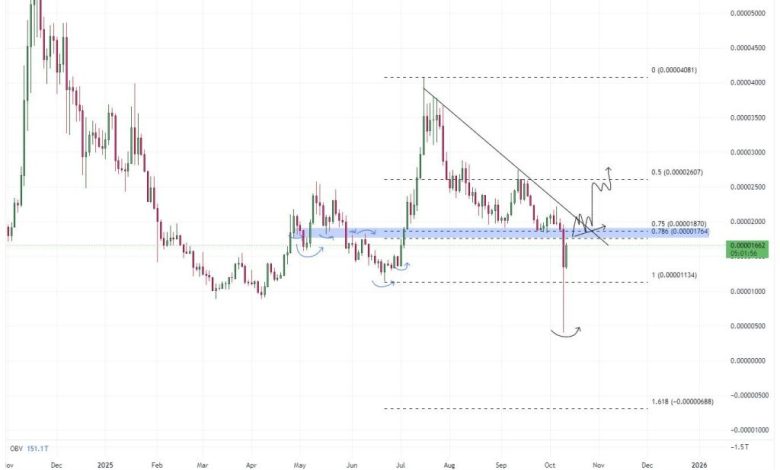 ناحیه کلیدی بعدی بین ۰.۰۰۰۰۱۷۶۴ و ۰.۰۰۰۰۱۸۷۰ USDT قرار دارد. یک بسته شدن پایدار بالای این سطح می‌تواند یک رالی به سمت ۰.۰۰۰۰۲۶۰۷ USDT و به طور بالقوه تا ۰.۰۰۰۰۳۰۰۰ USDT را به راه بیندازد.