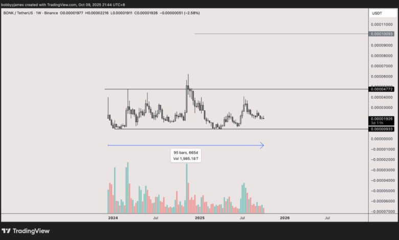 شرایط تکنیکال نیز در حال همگرایی هستند. BONK برای بیش از ۶۵۰ روز در فاز انباشت (accumulation) قرار داشته، به همین دلیل بسیاری از معامله‌گران پیش‌بینی یک رالی قدرتمند در آینده نزدیک را دارند. نمودار آن بسیار شبیه به الگویی است که DOGE قبل از صعود عمودی خود نشان داد. ممکن است قدرت پامپ آن به اندازه دوج‌کوین نباشد، اما الگوی پایه تقریباً یکسان است.