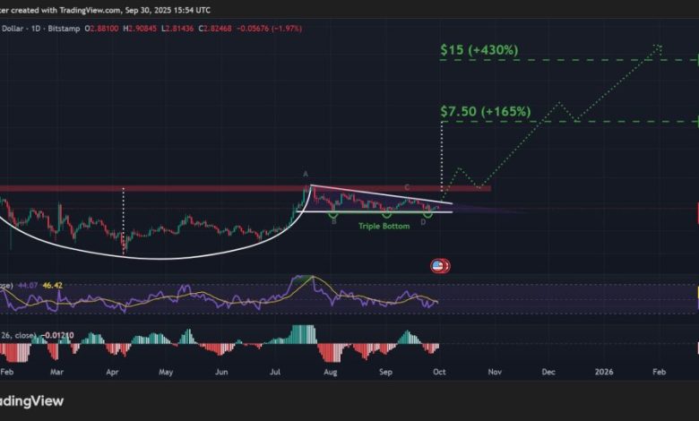 آستانه کلیدی برای یک شکست تأییدشده در حدود ۳.۶۰ دلار قرار دارد. پس از تبدیل این سطح به حمایت، الگوی فنجان و دسته میتواند تمام مومنتوم شکست خود را در یک حرکت ۱۶۵ درصدی به سمت ۷.۵۰ دلار محقق کند.
