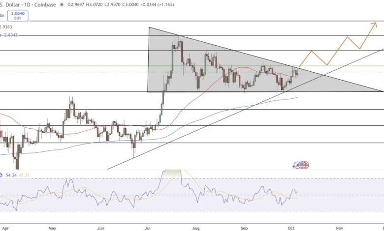 شتاب صعودی کنونی بر پایه محکمی شکل گرفته که در قالب الگوی مثلث متقارن از ماه جولای تشکیل شده است – الگویی که معمولاً مقدمه حرکتهای قیمتی قابل توجه است. این الگوی مثلثی، همگرایی سقفهای قیمتی و کفهای بالاتر را نشان میدهد که به معنای تعادل بین خریداران و فروشندگان است. با این حال، بسته شدن روزانه قیمت بالای سطح ۳.۰۰ دلار نشان میدهد که بالاخره شتاب صعودی در حال قوت گرفتن است.