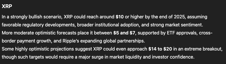 ChatGPT پیشنهاد میکند که اگر XRP بتواند به طور قاطعانهای بالای سقف جولای خود بشکند، میتواند تا پایان سال به بین ۵ تا ۱۰ دلار صعود کند، و در شرایط گاویتر، به طور بالقوه حتی به ۲۰ دلار نیز برسد.
