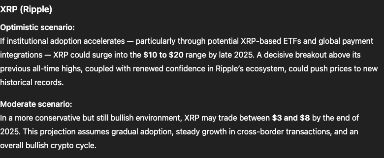 ChatGPT پیش‌بینی می‌کند که XRP ریپل ($XRP) به طور بالقوه می‌تواند قبل از سال نو به محدوده ۱۰ تا ۲۰ دلار صعود کند که در صورت تحقق سقف این محدوده، جهشی تقریباً هشت برابری از قیمت فعلی ۲.۵۷ دلار خواهد بود.