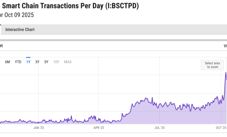 بر اساس YCharts، حجم معاملات در Binance Smart Chain در ۹ اکتبر به ۲۷.۴۹ میلیون دلار رسید. در ماه قبل، حجم معاملات ۱۳ میلیون دلار بود که نشان‌دهنده افزایش بیش از دو برابری است.