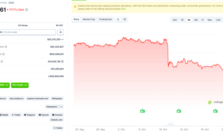 این اعلام، توکن کادنا (KDA) را به سقوط شدیدی کشاند. بر اساس دادههای کوینگکو، KDA در زمان اعلام حول و حوش ۰.۱۲ دلار معامله میشد که کاهشی بیش از ۴۷٪ در ۲۴ ساعت گذشته، ۷۷٪ در یک ماه و بیش از ۹۹٪ از最高 تاریخی ۲۷.۶۴ دلار خود در سال ۲۰۲۱ را نشان میداد.