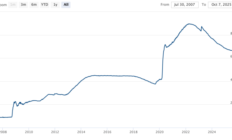 پاول تصریح کرد که “ریسکهای نزولی برای اشتغال افزایش یافتهاند” و کاهش دیگر نرخ بهره به اندازه یک چهارم درصد در جلسه ۲۸-۲۹ اکتبر محتمل remains likely. فدرال رزرو از میانه سال ۲۰۲۲ در حال کاهش غیرفعال ترازنامه خود بوده، زمانی که داراییهای آن پس از محرکهای دوران همهگیری به نزدیک ۹ تریلیون دلار رسیده بود.
