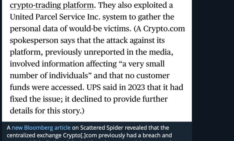 بر اساس تحقیقات بلومبرگ، صرافی ارز دیجیتال Crypto.com قربانی یک نقض دادههای قبلاً گزارشنشده توسط گروه هکری معروف Scattered Spider شده که منجر به افشای اطلاعات شخصی کاربران شد. این حمله توسط هکرهای نوجوان از جمله نوح اربن، یک نوجوان ۱۸ ساله از فلوریدا انجام شد که به یک چهره کلیدی در یکی از خطرناکترین سازمانهای سایبری جهان تبدیل شده است. این گروه مسئول حملات پرسر و صدا به MGM Resorts و سایر شرکتهای بزرگ است.