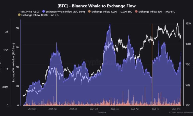 در ۳۰ روز گذشته، صرافی بایننس شاهد ورود ۵.۵۶ میلیارد دلار سرمایه از طریق تراکنشهای وال (Whale) بیش از ۱,۰۰۰ بیتکوین بوده که تنها در ۳۰ مهر (۲۱ اکتبر) مبلغ ۱.۰۷ میلیارد دلار به صورت متمرکز وارد این صرافی شد. این ورود سنگین سرمایه همزمان با افزایش قیمت بیتکوین از ۱۰۸,۰۰۰ به ۱۱۳,۰۰۰ دلار رخ داد، قبل از آن که قیمت اصلاح شود. این حجم عظیم ورودی، این سوال را مطرح کرده که آیا این بازیگران بزرگ در حال انباشت پوزیشن هستند یا دارایی خود را برای فروش و تسویه واریز میکنند.