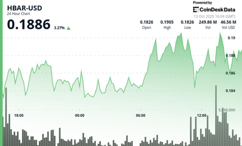 HBAR در طول دوره ۲۳ ساعته قبلی از ۱۵:۰۰ روز ۱۲ اکتبر تا ۱۴:۰۰ روز ۱۳ اکتبر، در پهنای باند ۰.۰۱۷ دلاری (۹ درصد) بین ۰.۱۷۴ و ۰.۱۹۱ دلار عمل کرد.