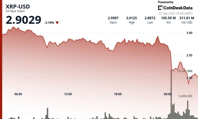 XRP در بازه 24 ساعته از 21 سپتامبر ساعت 03:00 تا 22 سپتامبر ساعت 02:00 نوسانات شدیدی را تجربه کرد و با نوسان 3.46 درصدی بین最高 قیمت 3.014 دلار و最低 قیمت 2.910 دلار مواجه شد. این کاهش قیمت همزمان با راه‌اندازی اولین صندوق قابل معامله در بورس (ETF) XRP در ایالات متحده رخ داد که با حجم معاملات روز اول 37.7 میلیون دلاری رکورد زد، اما کسب سود توسط نهادهای بزرگ (Institutional Profit-Taking) بر عامل صعودی غلبه کرد.